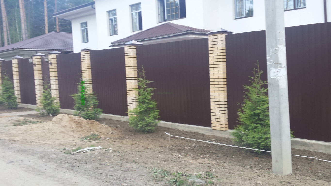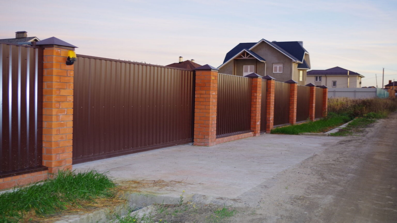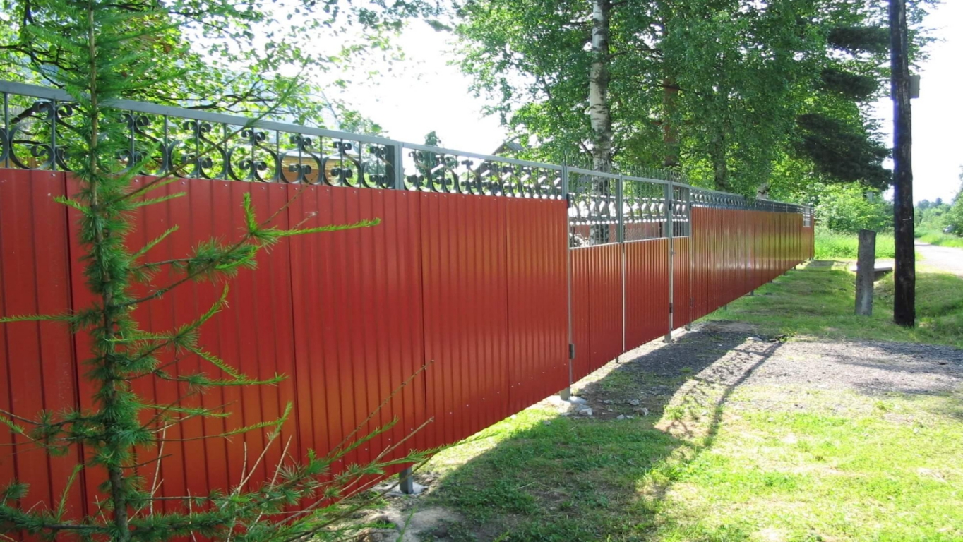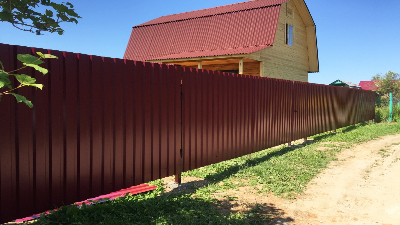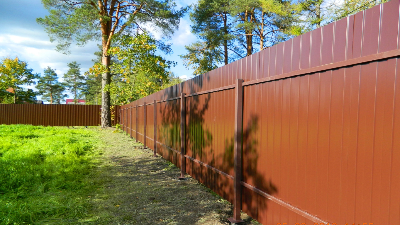 Мы используем профнастил C8 0,35—0,5 мм как наиболее подходящий по внешнему виду и для стойкости с учетом крепления на столбы каждые 2,5 м и по 3 лаги (2 лаги для заборов высотой 1,6 м и 1,3 м). Увеличение толщины профиля и/или изменение гофрирования в данном случае не увеличат прочность забора от внешних погодных воздействий, но повлияют на его стоимость. А сильное физическое или механическое воздействие не выдержит профнастил ни одной доступной толщины на рынке.
